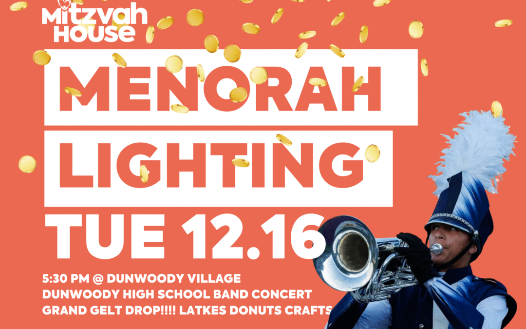 Menorah Lighting at Dunwoody Village by mitzva | Dec 16, 2025 | 0 comments When December 16, 2025 5:30 pm - 6:30 pm Add To Calendar Download ICS Google Calendar iCalendar Office 365 Outlook Live Where Dunwoody Village- The Bar(n) Dunwoody Village Pkwy, Dunwoody, GA, 30338 Map Unavailable December 16 @5:30 PM Fourth Annual Event! Community menorah lighting and holiday Submit a Comment Cancel replyYour email address will not be published. Required fields are marked *Comment * Name * Email * Website Save my name, email, and website in this browser for the next time I comment.
