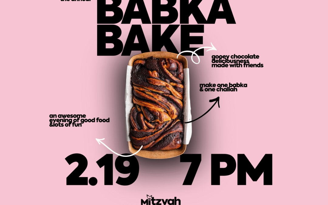 Big Babka Bake by mitzva | Feb 19, 2026 | 0 comments When February 19, 2026 7:00 pm - 8:30 pm Add To Calendar Download ICS Google Calendar iCalendar Office 365 Outlook Live An annual favorite. Want to host a table? Baking babka is even more fun with friends. Submit a Comment Cancel replyYour email address will not be published. Required fields are marked *Comment * Name * Email * Website Save my name, email, and website in this browser for the next time I comment.
